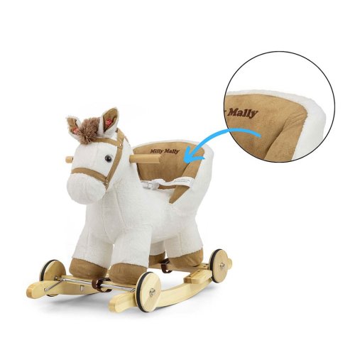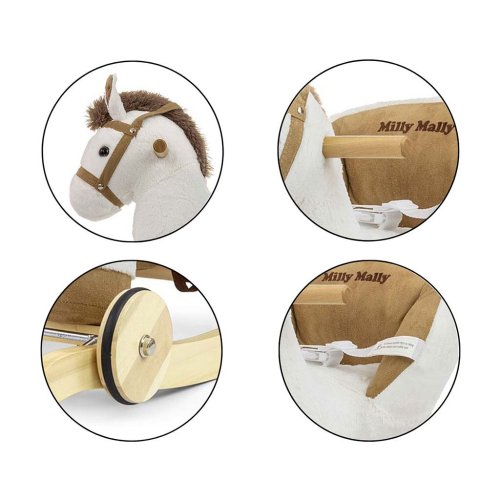 Měkoučký houpací koník Polly byl navržen pro nejmladší děti, pro které jsou tradiční houpací koně příliš velké. Pohodlné a tvarované sedadlo ve tvaru křesla a nastavitelné popruhy poskytují pohodlí a bezpečnost během bezstarostného houpání vašeho dítěte. Opěrky pro nohy na lištách a rukojeti ještě více pomáhají udržet rovnováhu. Překlopením jednoduchého mechanismu na lištách vysunete kolečka, čímž ve vteřině změníte houpací hračku v jezdícího koníka. Houpací lišty lze jednoduše odšroubovat. Po stisknutí ouška koník vesele zařechtá, po stisknutí druhého vydá zvuk klusajícího koně. Baterie se vkládají do poudra umístěného na bříšku.<BR>Charakteristika:<BR>- dřevěné houpací lišty s opěrkami pro nohy<BR>- hebký a příjemný materiál<BR>- pohodlné sedlo ve tvaru křesla<BR>- možnost demontáže houpacích lišt<BR>- baterie (2x AA) nejsou součástí hračky<BR>- nosnost do 30 kg<BR>- od 12 do 36 měsíců<BR> Rozměry:<BR>- výška 50 cm<BR>- výška na kolečkách +3cm<BR>- délka lišt 68 cm<BR>- délka koně 51 cm<BR>- šířka 34 cm<BR>- výška sedla od země 32 cm<BR>- vzdálenost sedadla od opěrek 28 cm<BR>- šířka sedla 20 cm<BR>- výška opěradla 15 cm<BR>Rozměry balení:<BR>- 61x47x36 cm<BR>- hmotnost netto 3,7 kg<BR>- hmotnost brutto 4,7 kg