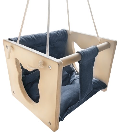 Houpačka z bukového a březového dřeva perfektně doplní vybavení každé zahrady, pergoly, terasy i dětského pokoje. Sedátko je vyrobené ze 100% bavlny, pro co největší pohodlí. Houpačku na stranách zdobí otvor ve tvaru kočky.