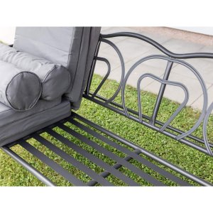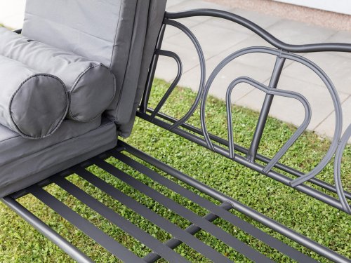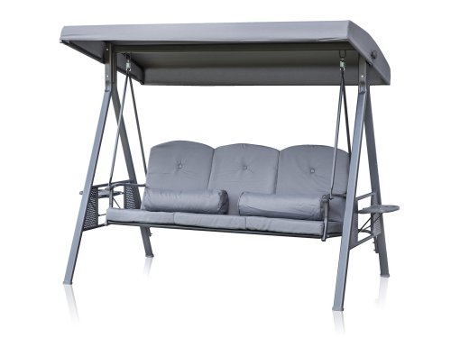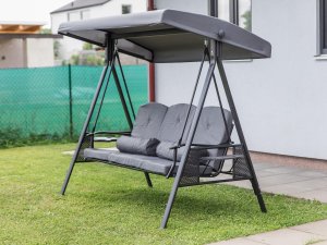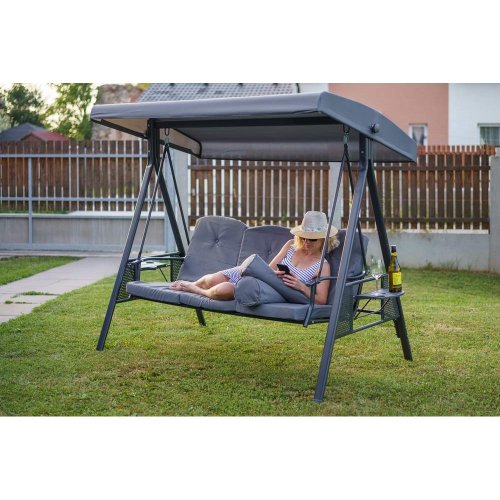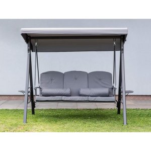 Zahradní houpačka RUJANA má vysoce stabilní masivní kovovou konstrukci, ošetřenou práškovým lakováním a 3 samostatné sedáky z polyesteru o síle cca 8 cm, které zajišťují komfortní posezení. Rozměry houpačky: 200 x 116 x 173 cm, nosnost 300 kg. Dalšími výhodami této houpačky je nastavitelná stříška proti slunci, doplňkový kulatý polštářek pro dokonalý relax a také dva výklopné stolky po stranách houpačky pro odložení oblíbeného občerstvení či knihy.