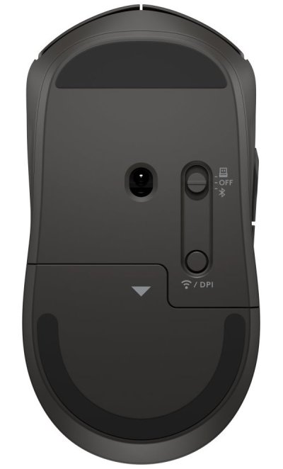 Bezdrátová myš HP 405, USB dongle 2,4 GHz, 1× baterie AA.