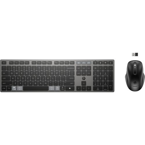 Typ připojení: 2,4GHz bezdrátové připojení; Bluetooth Bezdrátový dosah: Až 10 metrů Hardwarová kompatibilita: USB-A a Bluetooth Kompatibilní OS: Windows 11, Windows 10, ChromeOS, macOS Kontrolka LED: Indikátor baterie (klávesnice), Caps Lock (klávesnice), Indikátor kanálu (myš), Indikátor baterie (myš), Stav připojení (klávesnice) Software pro správu: Software HP Accessory Center DPI: Až 4000 Technologie snímače: Snímač pro každý povrch Počet tlačítek: 5 Typ baterie: Napájení superkondenzátorem (klávesnice, myš) Struktura kláves: Nůžkové klávesy Typ klávesnice: Plnohodnotná Životnost kláves: Až 10 milionů stisků pro všechny klávesy