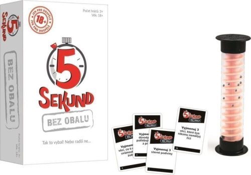 Otázky hry 5 Sekund Bez obalu jsou myšleny pro dospělé hráče a odpovědi budou ožehavé. Vyjmenovat tři využití jazyka se zdá snadné, ale zvládnete to do 5 vteřin, když váš jazyk zrovna nespolupracuje? Ostatní hráči vás bedlivě sledují, netrpělivě čekají na odpovědi a čas běží... Tak to vybal... nebo radši ne! Obsah balení: * 163 karet se 326 otázkami * 5 prázdných karet na vaše vlastní otázky * speciální časomíra * držák na karty * návod