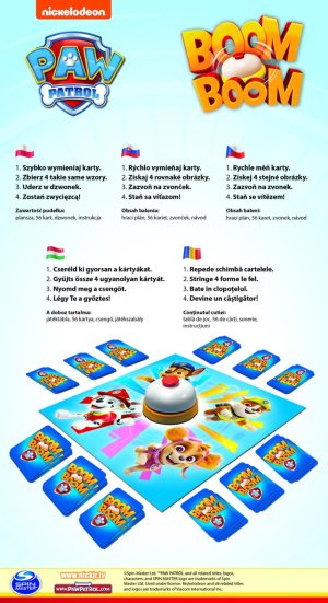 Vytvořte z karet balíček a zazvoňte na zvonek! Abyste vyhráli, musíte nasbírat kompletní sérii karet s postavami ze seriálu Tlapková patrola. Boom Boom - Paw Patrol je dynamická rodinná hra, ve které záleží na obratnosti, vnímavosti a dobrých reflexech. V Boom Boom se hráči snaží sbírat sady stejných pohádkových postav. Hráči si současně vyměňují své karty s kartami na hrací ploše. Poté, co hráč získá 4 stejné postavy, zazvoní na zvonek a signalizuje sbírku připravené hromádky. Rozměry balení 26 x 14 x 10 cm. Vhodné pro děti od 6 let.