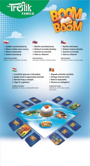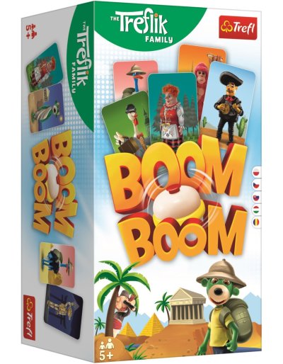 TREFL Boom Boom je dynamická rodinná hra, ve které hrají hlavní roli postřeh a dobré reflexy. V Boom Boom se hráči snaží sbírat sady stejných postav s postavičkami ze seriálu Treflíci. Všichni hráči si vyměňují své karty současně s kartami na hrací ploše. Po získání čtveřice karet hráč zazvoní na zvonek, aby signalizoval, že splnil úkol. Zní to jednoduše, ale karty na stole se neustále obměňují, neboť všichni hráči hrají současně a berou karty svých protivníků. První hráč, který nasbírá správný počet sad, je vítěz! Obsah balení: 56 karet, zvonek, hrací plán, návod v češtině , slovenštině. Vhodné pro hráče od 6 let.