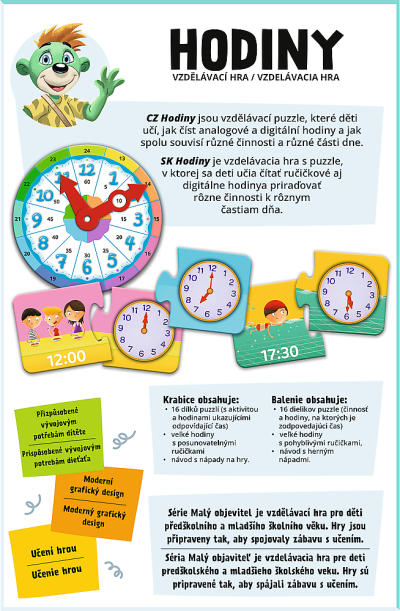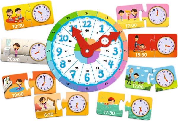 Vzdělávací skládačka, která pomáhá poznat fungování hodin a učí přiřadit různé činnosti příslušným částem dne. Rozvíjí schopnost plánování, základní matematické schopnostii