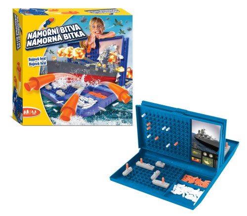 1× hrací deska s výklopnými poklopy 2 sady bitevních lodí 2 sady oranžových kolíčků (pro označení zásahů) 3 sady bílých kolíčků (pro označení nezasáhnutých polí) návod Vyhrává hráč, který jako první vyřadí všechny soupeřovy lodě. Hra nabízí spoustu taktické zábavy a napětí, kde každý tah může rozhodnout o vítězství.