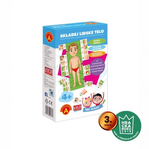 Ocenění Hračka roku 2018-3.místo. HRA ŠKOLOU® - SKLÁDEJ LIDSKÉ TĚLO, je naučná hra pro děti od 4 let, pomocí níž se děti učí zábavnou formou rozvíjet slovní zásobu a paměť. Pomocí „puzzle“ kartiček se učí rozpoznávat, kde je na těle ruka, oko, prsty, nos…. a správně je pojmenovat. Každá kartička má jiný tvar, je jiná a tak zapadne pouze tam, kam patří. Naučná HRA ŠKOLOU® - SKLÁDEJ LIDSKÉ TĚLO je krabička, se kterou holčičky a kluci objevují lidské tělo. Víte kolik prstíků je na ruce, kolik máme nohou? Nebo kde je nos, pusinka, či ouško? To vše se děti teď hravě naučí. Celá postava člověka a její části je rozdělena na 3 větší destičky a 18 menších. Pevné destičky do sebe perfektně zapadnou a drží pohromadě jako dílky puzzle. Manipulace s kartičkami velice snadná. Zapojit do hry se může i více dětských hráčů, kteří mohou napovídat a pomáhat si a tak zjistit, jak může být lidské tělíčko zábavné. Hra obsahuje 3 velké destičky pomocí níž si složíte postavičku chlapečka. Váš nový kamarád má na sobě označené tenké linky, které pomáhají správně najít, kde má hlavičku, nohu, ruku, zápěstí, oko, nos či pusinku. Menší kartičky se přikládají podél tělíčka a vždy správně zapadnou do výřezu, pokud děti zvolí správné místo. Děti hra nejen zabaví, ale také přirozeně rozvíjí své logické uvažování, pozorovací a kombinační schopnosti.Tato hra je také vhodná i do školek a kolektivů, kde se děti mohou střídat v pokládání jednotlivých dílků a navzájem se povzbuzovat a opravovat. Pomáhá malým dětem, ve spolupráci s dopělým, poznávat a pojmenovat části svého těla.BENEFITY:- Děti poznají tělo od hlavy až k patě- Pomáhá zlepšovat motoriku a soustředění- Pomáhá s rozvojem vyjadřování- Rozvíjí slovní zásobu- Rozvíjí logické uvažování Hra je vhodná pro děti od 4 do 7 let .Obsah balení: 3 ks velkých destiček z pevného kartonu, 18 ks malých destiček s částmi těla, český a slovenský návod
