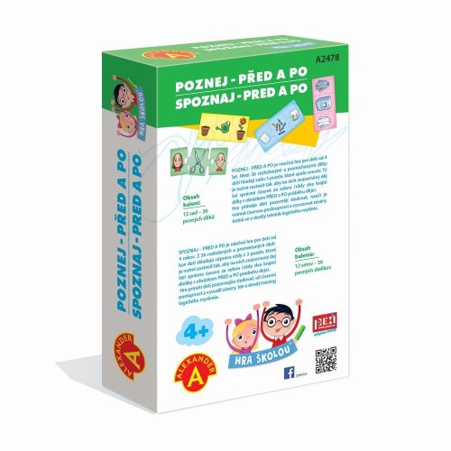 Hra školou® POZNEJ - PŘED A PO je naučné hraní pro malé zvědavce od 4 let, při kterém poznávají a upevňují znalosti o tom, co se děje PŘED a co PO. Každý případ se skládá ze 3 kartiček s vyobrazením události. Dětem při skládání pomáhají tvary dílků. Mezi 36 rozloženými a promíchanými dílky hledají děti sadu 3 společných dílků, které spolu souvisí. Ty je potřeba sestavit tak, aby na nich znázorněný děj šel správně časově za sebou (vždy dva krajní dílky s obrázkem PŘED a PO průběhu děje). Hra naučí děti pozorněji sledovat, naučí je poznávat časovou posloupnost a vyvozovat závěry. Jedná se také o skvělý trénink logického myšlení. Hra obsahuje: 36 pevných dílků s barevnými ilustracemi, které mají specifický tvar pro snazší spojování.