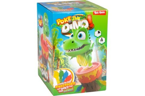 Společenská hra Vyskakující dino. Hráči jednotlivě vkládají ohnivé tyčky do základny a když se dotknou tyčkou draka, drak vylítne a hráč vypadává. Ke hře nejsou třeba baterie. Materiál plast. Balení obsahuje základnu, hlavu dinosaura, 16 tyček a arch se samolepkami. Baleno v krabici. Rozměry balení 19x12x12,5 cm. Určeno pro 2-4 hráče. Doba hry cca 15 minut. Věk 3+