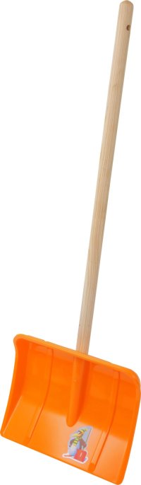 Dětské hrablo na sníh s oranžovou pracovní částí a dřevěnou násadou.