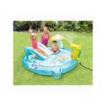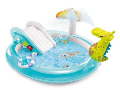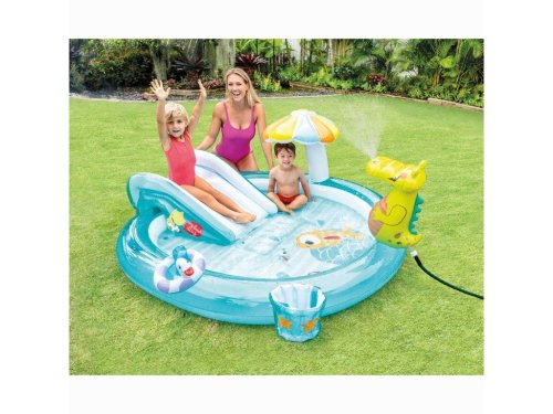 Nafukovací hrací centrum se skluzavkou a bazénkem v designu vodního světa o velikosti 201 x 170 x 84 cm. Dopřejte si vodní radovánky u vás na zahradě. Nafukovací hrací centrum se skluzavkou, vodní sprchou a příslušenstvím přímo vybízí k vodní zábavě. Bazének osvěží v parných letních dnech především ty nejmenší. Výhodou hracího centra Intex je jednoduchá instalace. Stačí rozložit bazének na hladkou vodorovnou a dostatečně stabilní plochu, nafouknout a napustit vodu. Centrum obsahuje bazének, aligátora vodní sprchu napojitelnou na zahradní hadici, skluzavku, slunečník ve tvaru houby, nafukovací kačenku a rybářský kbelík.