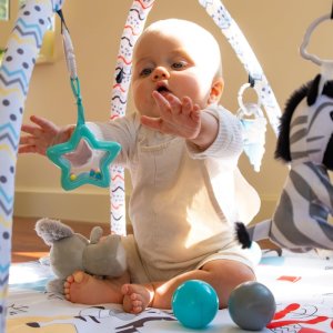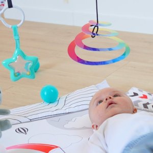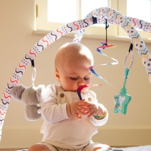 • na hrazdičce je zavěšeno 5 hraček s různými aktivitami - lze je sundat a zaměnit za jiné
