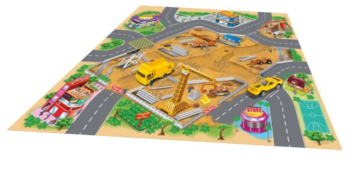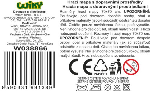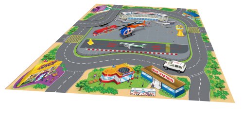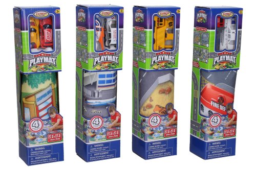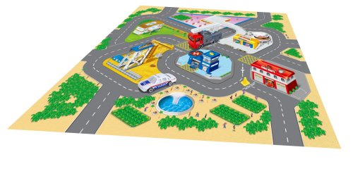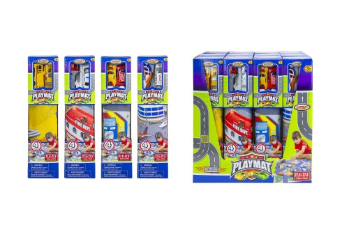 Hrací mapa s 2 dopravními prostředky. Rozměry hrací mapy 70x70 cm, dopravních prostředků 6-8 cm. Součástí textilní hrací mapa, 2 kovové dopravní prostředky. 4 varianty - záchranné složky, letiště, stavební, závodní.