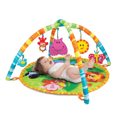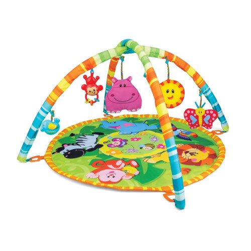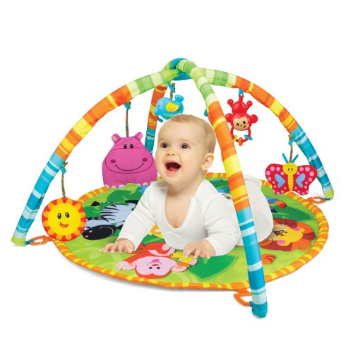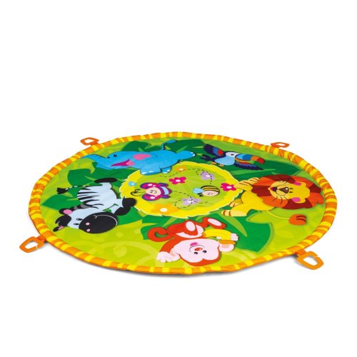 Hrací podložka Kamarádi z džungle skvěle zabaví miminko a podporuje jeho rozvoj. Motivuje k poznávání barev, tvarů a materiálů, a také k pohybu. Podložka je vhodná pro hraní na zádech, na bříšku i v sedě. Visací hračky lze snadno umístit na konstrukci upevněnou k podložce, čímž poskytují ještě více zábavy a interakce.