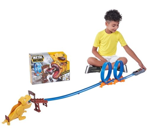 Vstupte do světa akčních závodů s Playsetem T-REX. Tento dynamický set je navržen pro děti od 4 let a nabízí vzrušující zážitek z rychlých jízd a překonávání překážek.Obsah balení: 1× kovový model auta – včetně modelu Bone Crusher, 1× výkonný odpalovač – pro rychlé starty,2× rovné modré dráhy – pro vytvoření závodní trati, 1× T-Rex hlava – s odnímatelnou horní částí, kterou je třeba překonat, 1× spojovací prvek – pro propojení dráhy, 1× náhradní gumička – pro odpalovač a 1× návod – pro snadnou montáž.