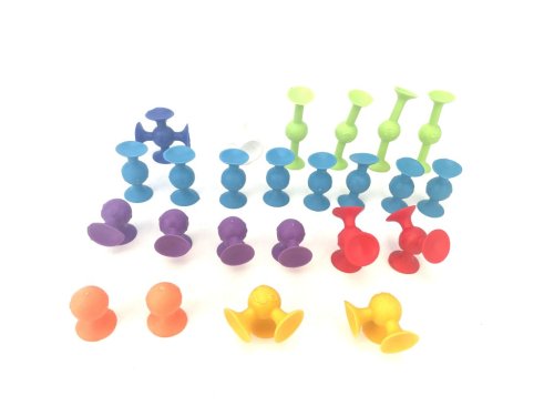 Set obsahuje osm různých tvarů v pestrých barvách, jako jsou modrá, zelená, červená, fialová, oranžová a žlutá. Díky této barevné rozmanitosti a různým konstrukčním tvarům mohou děti rozvíjet svou kreativitu, představivost a jemnou motoriku. Dílky mají jednoduchý kulatý tvar s přísavkami na obou koncích, což umožňuje jejich spojování do různých struktur a tvarů.