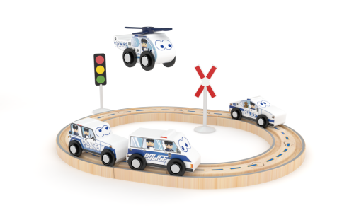 J`adore je řada vzdělávacích hraček pro nejmenší, vyrobených z ekologicky udržitelného dřeva, bez chemikálií. Produkt stimuluje dětskou fantazii. Set je vhodný pro děti od 18 měsíců. Set obsahuje koleje a vozidla v designu policie.