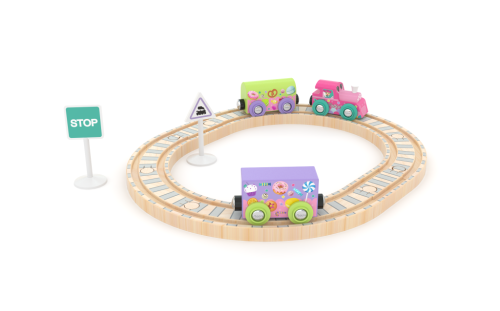 J`adore je řada vzdělávacích hraček pro nejmenší, vyrobených z ekologicky udržitelného dřeva, bez chemikálií. Produkt stimuluje dětskou fantazii. Set je vhodný pro děti od 18 měsíců. Set obsahuje koleje a vláček v barvách a designu pro malé princezny. Koleje jsou široké 4 cm.