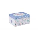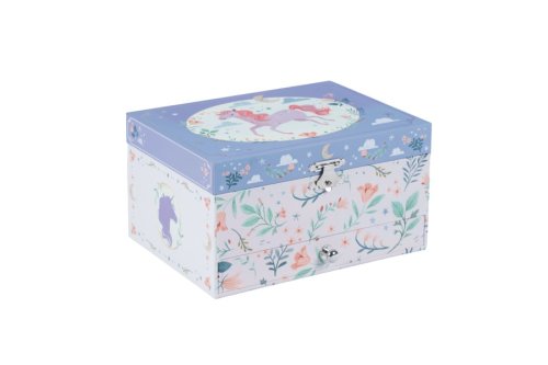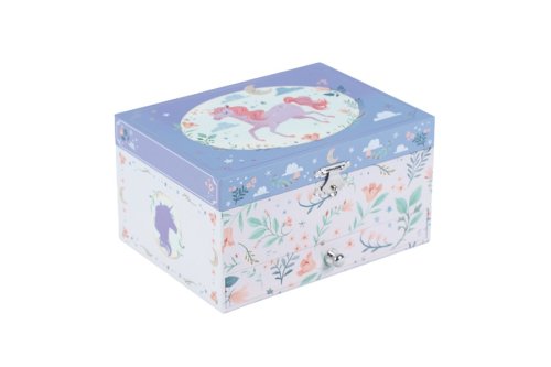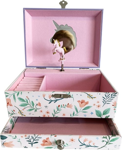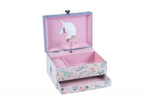 po otevření skříňky začne hrát jemná melodie a malý jednorožec se otáčí před svým zrcadlem součástí je jedna zásuvka a malé přihrádky na uložení šperků vyrobeno z tvrdého odolného papíru