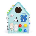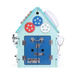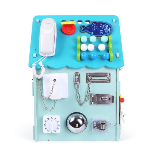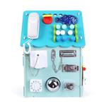 Barva domečku na fotografii je ilustrativní, ve skutečnosti se barevné tyrkysové odstíny mohou trochu lišit. Od zvonku až k telefonu! Tento domeček přináší spoustu zábavy, díky které bude moci Vaše dítě rozvíjet svou zručnost, zvídavost a zejména jemnou motoriku. Zámky, pásky a tkaničky dávají dítěti možnost procvičovat různé vázaní, spojování, otáčení či otevírání a připravit se tak zábavným způsobem na každodenní úkony. Mimo aktivit zapojující smyslové dovednosti deska disponuje i edukativními prvky jako je počítadlo nebo hodiny. Domeček se dodává složený v krabici. Hlavní vlastnosti: podporuje nezávislost, jemnou motoriku a koordinaci ruka-okopodněcuje kreativní myšlení a vývoj představivostitelefonní sluchátko neobsahuje kabel, což eliminuje riziko uškrcenísenzorická stimulaceedukace skrze hrudomeček se dodává složený v krabici