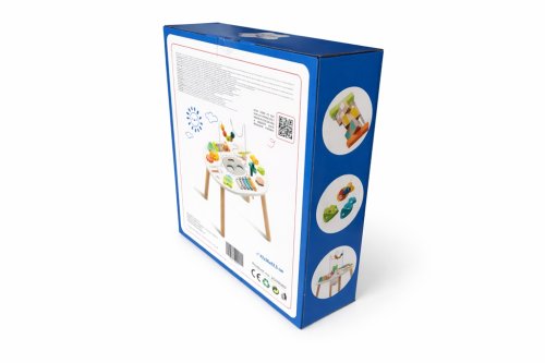 Motorický stolek 2Kids Toys byl navržen tak, aby hravou formou stimuloval dětské smysly. Děti mohou prozkoumávat různé materiály, trénovat koordinaci pohybů a logické myšlení. Díky pestré paletě činností – od hudebních až po manipulační – bude stolek děti bavit celé hodiny. Stolek je vyroben z kombinace dřeva, kovu, plsti, tkaniny a magnetů, což zajišťuje nejen dlouhou životnost, ale i zajímavý hmatový zážitek.