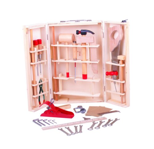 Úžasná sada nářadí značky Bigjigs Toys pro všechny malé opraváře. Je tu všechno, co mladý zpracovatel dřeva potřebuje k tomu, aby využil své zručnosti. Děti budou mít všechno nářadí pohromadě v dřevěném kufříku. Vnitřek kufříku obsahuje praktický organizér v podobě západek a speciálních otvorů. Tento organizér zajistí, že veškeré nářadí zůstane na svém místě při manipulaci s kufříkem. Kufřík obsahuje šroubováky, pily, klíče, kladiva, plus mnoho dalších nástrojů. Vyrobeno z vysoce kvalitních materiálů. Vyhovuje současným evropským bezpečnostním normám. Sada obsahuje 28 ks nářadí a je vhodná pro děti od 8 let.
