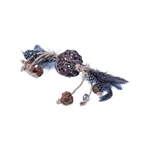 Hračku tvoří ratanový míček, k němuž jsou připevněná peříčka a jutové provázky s rolničkami a kuličkami z lisovaného catnipu (šanty kočičí) a matatabi (japonského kiwi), jejichž vůně je pro mnoho koček přitažlivá. Různorodé textury a přírodní materiály stimulují přirozené lovecké instinkty kočky a podněcují ji k aktivní hře. Rozměry (cca): 4,5 × 8 cm Materiál: ratan, matatabi, juta, peří Upozornění: Hračka není určena dětem. Na matatabi a šantu kočičí mohou kočky reagovat rozdílně. K použití pouze pod dohledem. Hračku pravidelně kontrolujte a v případě poškození přestaňte používat.