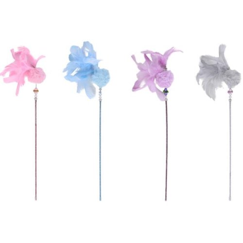 plastová hůlka se třpytkami s cinkajícími rolničkami, korálky, plyšovou bambulkou a hustými peříčky zahání nudu, stimuluje lovecký instinkt