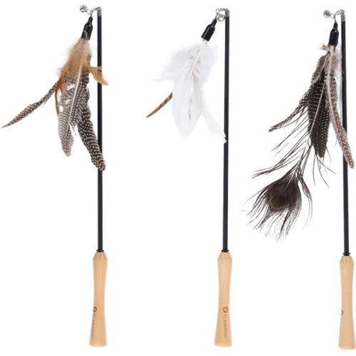 sklolaminátová hůlka s dřevěnou rukojetí s cinkající rolničkou, hustými peříčky a dřívkem matatabi zahání nudu, stimuluje lovecký instinkt vyměnitelný/rozšiřitelný závěs nastavitelná délka hůlky