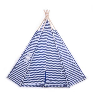Velice snadno. Jelikož je celý plášť stanu doručován v kuse a je dokonale připraven pro montáž, stačí jen provléknout dřevěné tyče příslušnými tunýlky, nahoře tyče svázat a teepee je na světě! Podlážku položte na podlahu teepee. Vchod do stanu můžete buď zabezpečit pomocí připevněných provázků pro trvalé otevření, nebo jej spustit dolů a dopřát dětem soukromí.