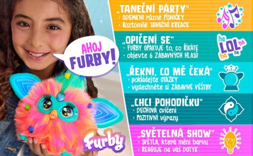 Poznej svého nového nejlepšího kamaráda! Furby má 5 režimů hry, které lze aktivovat (s 3 dalšími unikátními režimy!). Uši mění barvu v režimu Světelné show; Furby hraje hudbu v režimu Tanec; má pohyblivá uši, oči, nohy a tělo; mluví český i furbijsky. V balení jsou příslušenství pro stylování a hraní