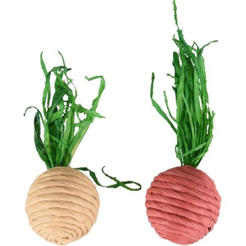 Hračka z přírodních materiálů pro zabavení v kleci a podporu hlodání a obrušování hlodavých zubů. Kuličky spletené z přírodních vláken napodobující ředkvičky, s kukuřičným šustím místo natí. Rozměry: průměr 4,5 cm Balení obsahuje 2 ks.