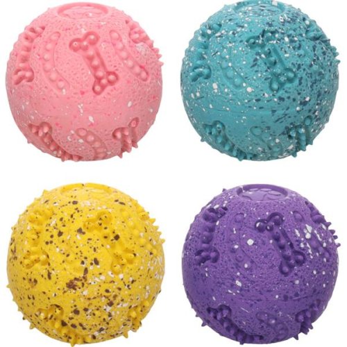 Aportovací a kousací míček pro psy je vyrobený z latexu a pro ještě větší potěšení ze hry je opatřený pískátkem. Na povrchu hračky jsou výstupky a prohlubně, které napomáhají přirozenému čištění zubů a masírují dásně a jazyk. Do prohlubní lze navíc zapravit polotuhé krmivo, které psa motivuje k delší hře. Velikost: S Rozměry (cca): Ø 6 cm Materiál: latex Barva: fialová, modrá, žlutá, růžová – zasíláme dle aktuální skladové zásoby. Přejete-li si konkrétní barvu, napište ji do poznámky k objednávce. Upozornění: Hračka není určena dětem. K použití pouze pod dohledem. Hračku pravidelně kontrolujte a v případě poškození přestaňte používat.