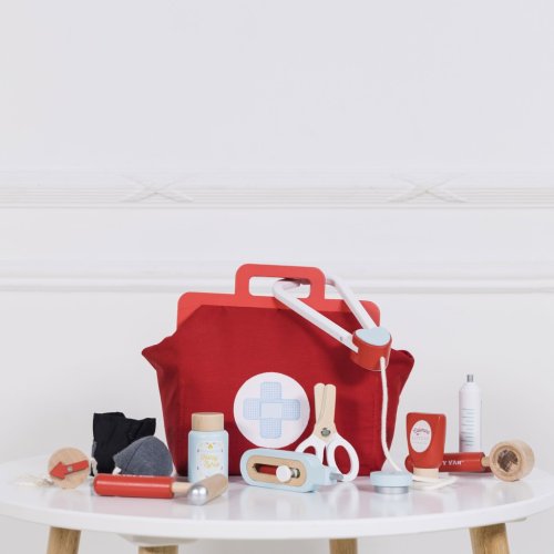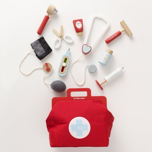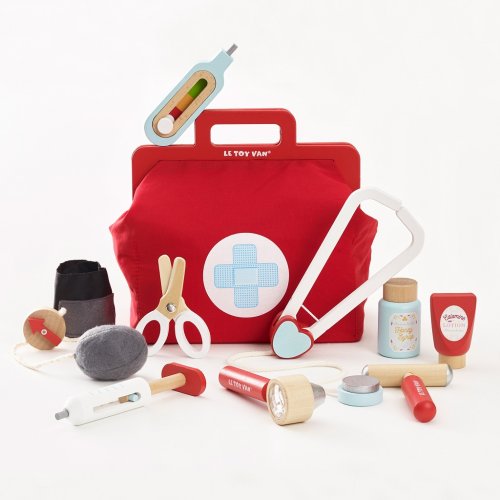 Ošetřuje vaše dítě rádo členy rodiny, domácího mazlíčka nebo si hraje na lékaře pro své plyšáky? Usnadněte mu hraní a darujte mu krásnou doktorskou brašnu s příslušenstvím od značky Le Van Toy. Dopřejte mu, ať si otevře imaginární ordinaci, kterou budou navštěvovat jeho hračky. V brašně najde celkem 9 kusů různých nástrojů – stetoskop, tlakoměr na suchý zip, posuvný teploměr, jehlu, otevírací chirurgické nůžky, masti s otočným víčkem a další pomůcky. Jsou bezpečné a vhodné pro děti od 3 let.