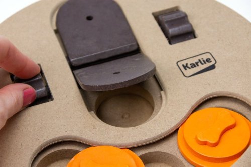 Pro šťastný život psa je kromě fyzické aktivity také důležité pravidelně psa psychicky trénovat. V tomto ohledu poskytují smysluplnou aktivitu hračky pro psy Karlie ze série Doggy Brain Train. Pes hledá svou odměnu otevřením úkrytů posunutím panelů a zvednutím poklopu. Majitelé mohou pomoci a nejdříve psa navést na správnou stopu. Tato intenzivní interakce posiluje pouto mezi lidmi a zvířaty a pomáhá psovi budovat důvěru. Stabilní a kvalitní dřevěná deska je robustní a má průměr 23 cm.
