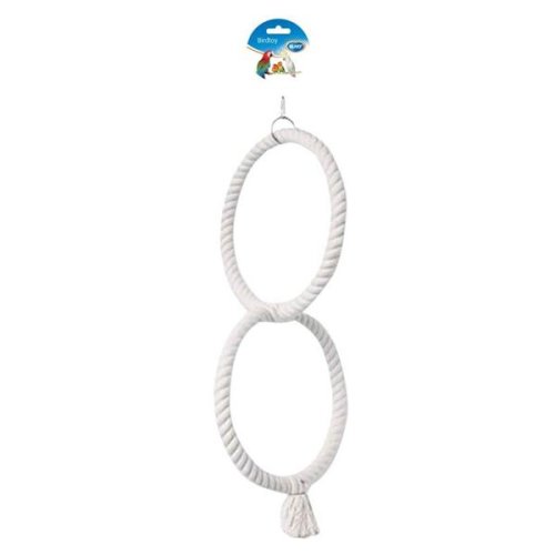 Dva kovové kruhy omotané bavlněným lanem jsou k sobě navíc spletené. Hračka slouží papouškům ke hře i odpočinku. Vhodné pro středně velké papoušky. Snadné připevnění ke kleci nebo do voliéry pomocí kovové karabinky nebo očka. Rozměry: 50 cm výška zavěšené hračky 17 cm vnitřní průměr kruhu