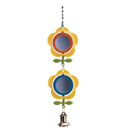 Závěsná plastová hračka pro papoušky – 2 květiny se zrcátkem a zvonečkem. Hračka je vhodná pro menší typy papoušků, např. andulky, kanárky, atd. Snadné zavěšení do klece či voliéry. Rozměry: 28 cm (výška zavěšené hračky).