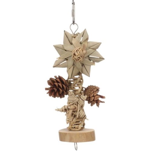 Přírodní závěsná hračka z ratanu, dřeva kávovníku, borových šišek a palmových listů je vhodná pro různé druhy papoušků. Podporuje mentální aktivitu a přirozenou péči o zobák. Díky kovovému závěsnému systému ji lze snadno zavěsit do klece nebo voliéry. Součástí hračky jsou šišky, korálky, spirála, hvězdičky a provázek, které vybízejí k ozobávání. Použité materiály jsou přírodní a bezpečné pro papoušky. Rozměry (cca): 10 × 6 × 23 cm Materiál: ratan, dřevo kávovníku, šišky, palmové listy a kov