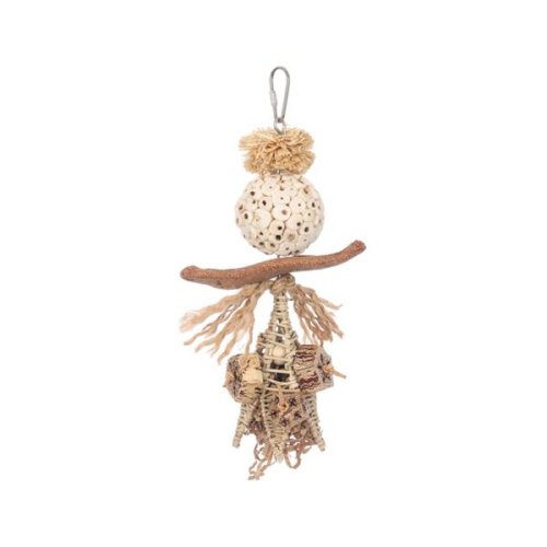 Závěsná hračka z dřeva sola, kukuřičného listí, vrbových větviček, lusků mahagonu, jutového provazu a kovového drátu je vhodná pro různé druhy papoušků. Podporuje šplhání, ozobávání a aktivní hru. Díky kovové karabince ji lze snadno zavěsit do klece nebo voliéry. Použité přírodní materiály jsou bezpečné a přizpůsobené potřebám ptáků. Rozměry (cca): 27 × 12 cm Materiál: dřevo sola, juta, kukuřičný list, vrbové proutí, mahagonový lusk, kov
