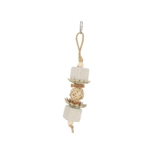 Závěsná hračka pro papoušky z pemzy, slunečnicového stonku, palmového listí, ratanu a papírového provazu obsahuje vápník a esenciální minerály. Podporuje přirozené obrušování zobáku, zdravý metabolismus a pevnost kostí. Hračka stimuluje mentální i fyzickou aktivitu a pomáhá zahnat nudu. Díky kovové karabince ji lze snadno zavěsit do klece nebo voliéry. Vyrobena z bezpečných materiálů bez škodlivých látek. Rozměry (cca): 32 × 8 cm Materiál: pemza, ratan, papír, stonek slunečnice, palmový list, kov