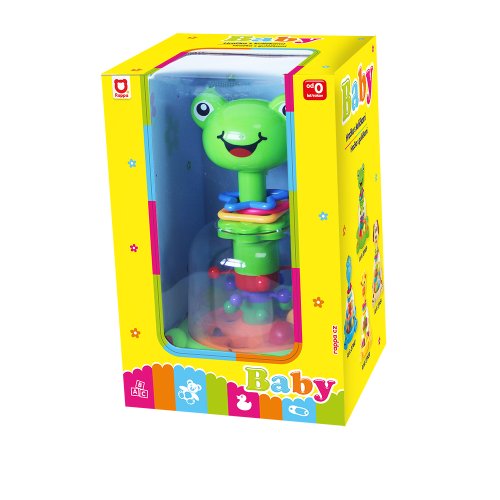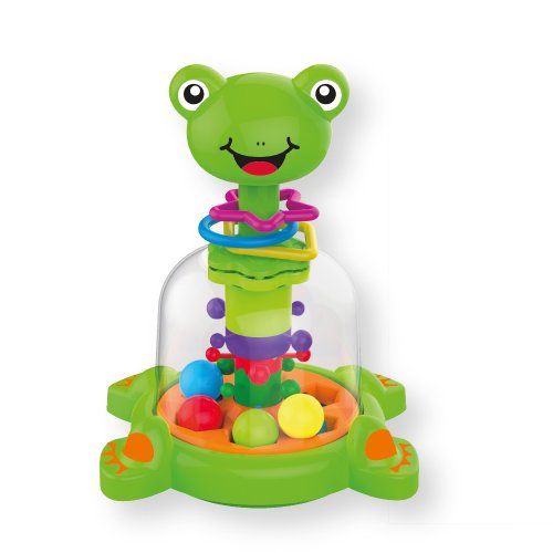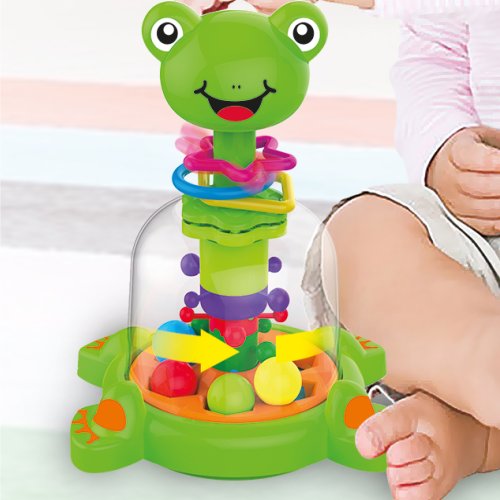 Pestrobarevný mechanický kolotoč ve tvaru žáby je naplněný barevnými kuličkami, které budou po zmáčknutí hlavy rotovat, skákat a vydávat chrastící zvuk.Tato hračka zaujme a pobaví i ty nejmenší děti.