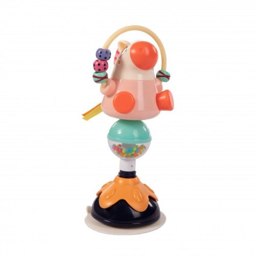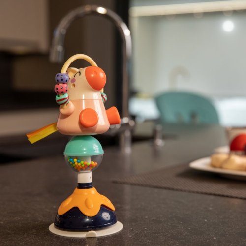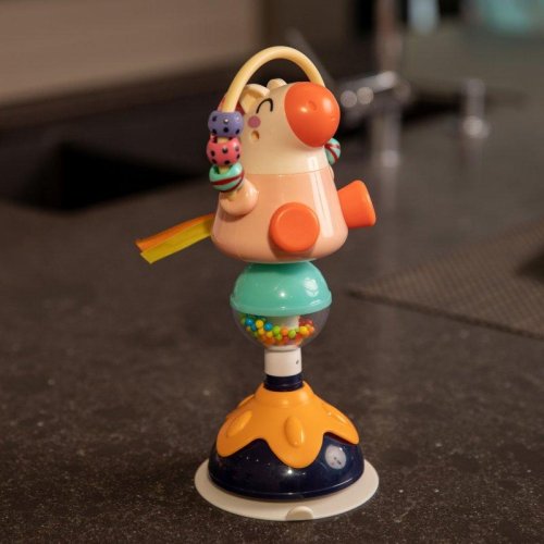 Plastová hračka s přísavkou, pomocí které se připevní k jídelnímu pultíku, a tím se zabrání tomu, aby ji Vaše dítko házelo na zem.