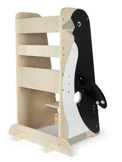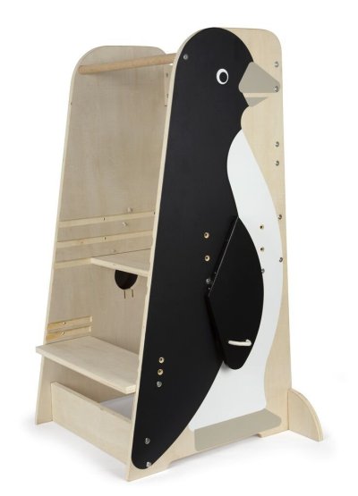 Učící věž 3 v 1 značky Small Foot funguje jako praktická víceúčelová stolička. Učící věže umožňují nejmenším dětem být v úrovni pracovní desky, vidět vše, co děláte, a pracovat s vámi. Pokud chcete, aby vaše dítě bylo součástí běžných činností u kuchyňské linky, v koupelně nebo u pracovního stolu, učící a pozorovací věž v designu tučňáka se jistě stane vašim každodenním pomocníkem. Je robustní a stabilní a díky ní se děti mohou zapojit do veškerého dění v domácnosti ve stejné výšce jako dospělí. Má výškově nastavitelnou plošinu a schůdek, poroste tedy s dítětem, a zábrana zajistí jeho bezpečnost. Skládací křídla tučňáka poskytují úložný prostor pro utěrky, chňapky a další drobnosti. Při používání nenechávejte učící věž v prostoru, ale vždy věž umístěte stranou naproti schůdku k pevné překážce (kuchyňská linka apod.).