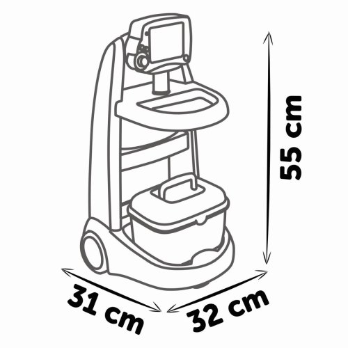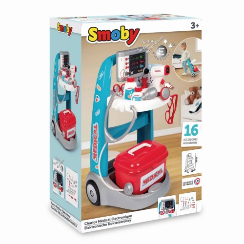 Elektronický lékařský vozík se 2 kolečky. Mobilní nouzový vozík je lehký a ovladatelný i pro menší děti. Elektronický modul EKG má četné funkce a zvukové efekty, díky nimž je hra na doktora realističtější. V úložných prostorách je vše, co je třeba pro naléhavé případy pro ošetření pacientů: infuzní kapačku, lékařský kufřík s nespočtem pomůcek, jako je injekční stříkačka, teploměr, nůžky, sklenice, stetoskop, makety obalů od léků a mnoho dalšího. Rozměry produktu (DxŠxV): 31 x 32,1 x 55,2 cm.