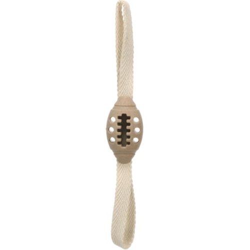 Hračka pro psy ve tvaru ragbyového míče je vyrobená z termoplastické gumy (TPR) s bambusovým vláknem. Při kousání masíruje dásně a pomáhá omezovat tvorbu zubního plaku, čímž přispívá k přirozené péči o chrup. Úchyty na obou koncích hračky slouží k interaktivní hře a přetahování. Prohlubně v míčku lze naplnit pamlsky nebo jedlou pastou a zvýšit tak motivaci ke hře. Rozměry (cca): 35 × 5,4 × 5,3 cm Materiál: TPR (termoplastická guma), bambus Barva: hnědá, béžová Upozornění: Hračka není určena dětem. K použití pouze pod dohledem. Hračku pravidelně kontrolujte a v případě poškození přestaňte používat.