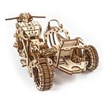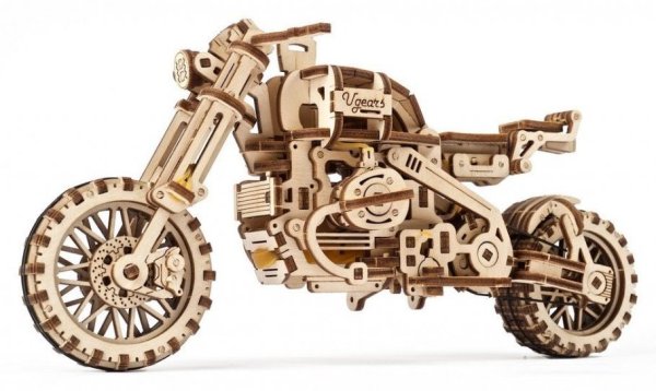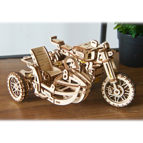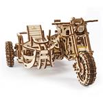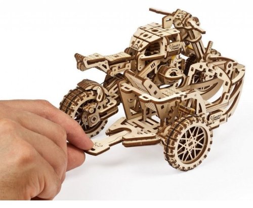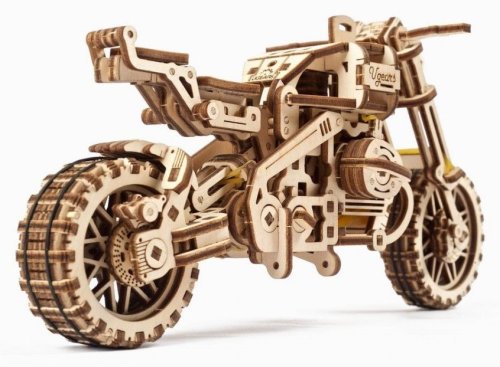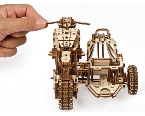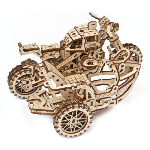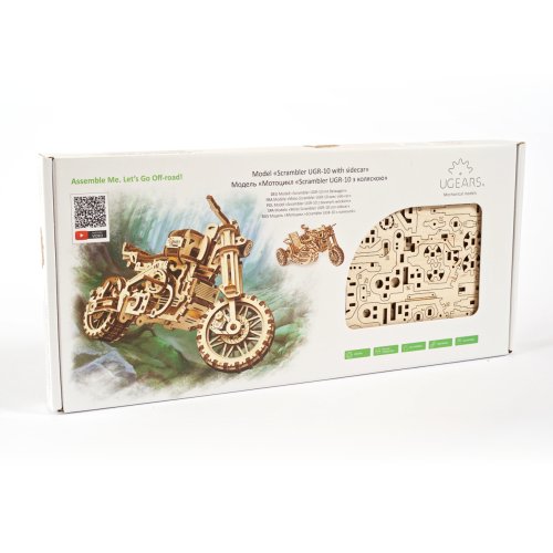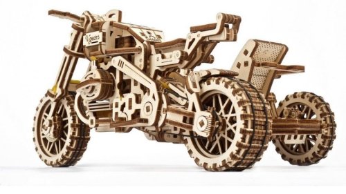 Vydejte se cestou necestou. Stavebnice motorky typu scrambler se sajdkárou vyrobená z překližky. Model je realisticky vybaven stojanem a stroj si tak můžete vystavit zvlášť i bez vozíku. Mechanika je do detailu propracovaná, a vy tak můžete pozorovat pohyb pístů motoru. Motorka je řiditelná a díky natahovacímu mechanismu je schopna jízdy, na jedno natažení urazí až 3 m. Natahuje a spouští se zvlášť určenými klíči. Jízdní dynamice slouží odpružení obou vidlic. Uspořádejte závody s dalšími modely UGEARS! Vybaveno detailním návodem k sestavení. Hlavní vlastnosti: 380 precizně vyřezaných dílkůstřední obtížnost sestaveníodpružené vidlicevýsledný model je řiditelný a schopný samostatné jízdynavrženo a vyrobeno na Ukrajině