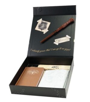 Dárková sada v pevném boxu. Balení obsahuje A5 zápisník, psací pero/hůlku, 2× tužku, pravítko, ořezávátko, gumu, 6 obálek, 12 dopisních papírů, 5× arch samolepek a 10× pečetní samolepky na dopis.