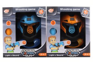 Propracovaná sada pistole na pěnové míčky a terčem ve tvaru masky.