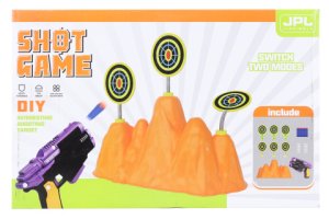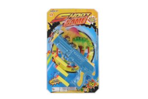 Plastová pistole s pěnovými náboj a papírovým terčem na který můžete střílet.