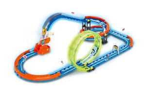 Dráha se svítícím autíčkem. Rozměry sestavené dráhy 88x27x48 cm.